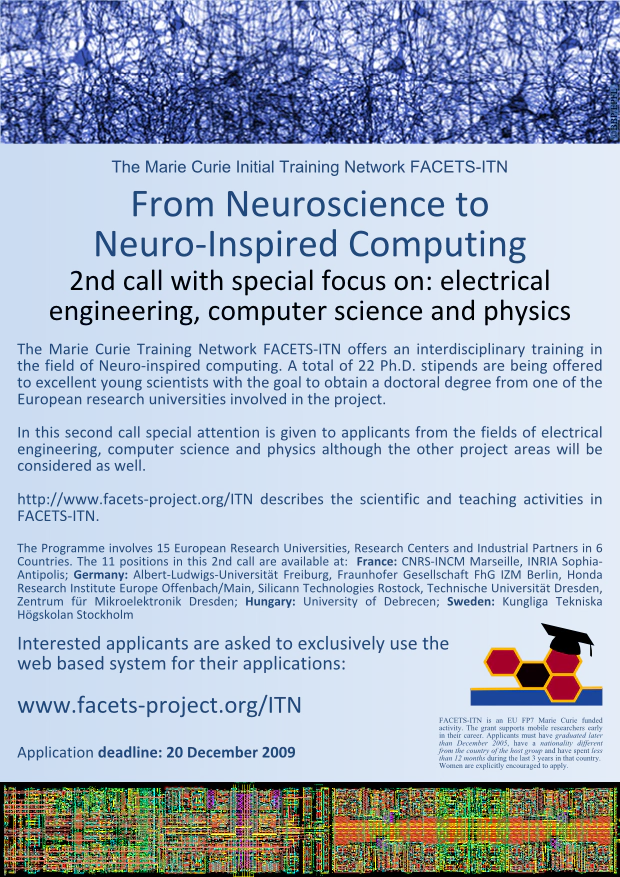 FACETS ITN project (EU funding, grant number 237955) is a ‘Marie-Curie Initial Training Network’ involves 15 groups at European Research Universities, Research Centers and Industrial Partners in 6 countries. 22 Ph.D. Positions are funded in the FACETS-ITN project in the following scientific work areas: Neurobiology of Cells and Networks, Modelling of Neural Systems, Neuromorphic Hardware, Neuro-Electronic Interfaces, Computational Principles in Neural Architectures, Mechanisms of Learning and Plasticity.