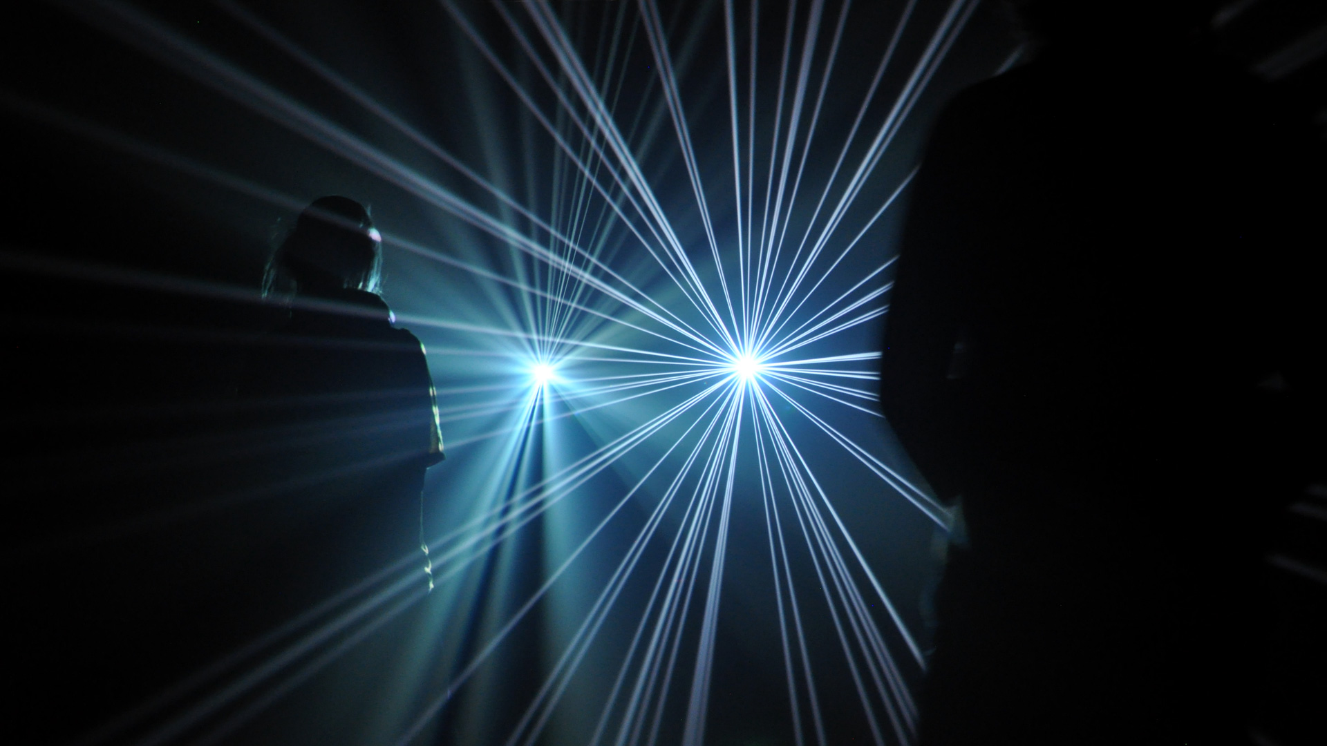 - « Tropique » est une installation artistique créée par Etienne Rey en collaboration avec Wilfried Wendling (son) et sous mon expertise scientifique. Elle a été produite pour l’Année européenne de la culture d’Aix-Marseille et présentée en 2013 à la fondation Vasarely. Cette installation immersive consiste en une sculpture de lumière incluse dans un espace fermé de 20 mètres de longueur sur 15 mètres de large. La salle est remplie de minuscules billes d’eau transparentes en suspension. Elles produisent une diffraction visible lorsqu’elles sont illuminées par les vidéoprojecteurs qui sont placés aux bords opposés de la salle. Les sources de lumière projettent des segments qui composent l’alphabet de la sculpture. Chaque segment est caractérisé par sa position, sa longueur et son orientation et chacun crée une lame de lumière dans l’espace de la salle. Une fois les segments combinés, ils forment un monde propre à la sculpture et isolé du monde habituel (voir aussi cet article). La grammaire qui régit les mouvements de ces segments est inspirée par les forces d’attraction et de répulsion observées aux tailles microscopiques des cellules et macroscopique des galaxies. Cette population de segments évoluait alors comme un système autonome, sans scénario pré-écrit ou enregistré et complété par une synchronisation des différentes sources de lumière ainsi que du système de génération spatiale du son. Un point crucial de l’installation était d’introduire une interaction intime entre ce système et chaque observateur. Un discret système de capteurs de mouvement permettait de localiser la présence des différents observateurs et de modifier la configuration de la sculpture en fonction de leurs mouvements. Le système évoluait ainsi de façon autonome d’une sculpture de lumière que l’on pouvait regarder et toucher à une configuration dans laquelle le spectateur était plongé dans un monde propre, intime. Dans cet état, les segments alignés autour de l’observateur formaient une “aura” où tout repère de perspective était perdu. Ce dispositif, en manipulant visible et invisible, levait alors le voile sur des mécanismes cachés de la perception