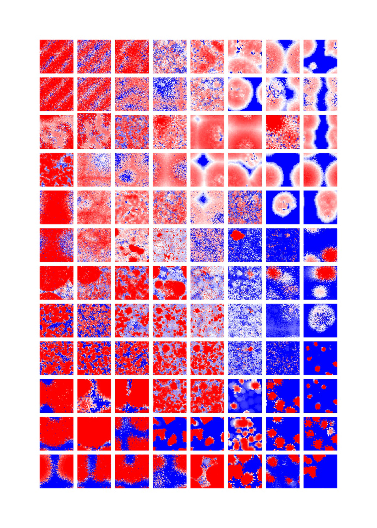 There are structures in nature that spontaneously emerge. They were studied for the first time by the English mathematician Alan Turing (1912 – 1954), who also introduced the concept of the contemporary computational machine. Examples of those shapes are stripes, spots, grids, tessellations, bubbles, spirals, foams and waves. In the specific case of this artwork, a collection of Turing patterns are generated via brain simulations. Each square is a network of neural cells that fire with low (blue), medium (white) and high (red) intensities. Many of them look very similar, while others are very different. Grouped as they are, pictures seem to have a graphical continuity with their closest. But, this visual feature is indeed a Gestalt illusion, because they are completely independent simulation results.