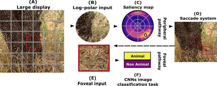 Visual search, that is, the simultaneous localization and detection of a visual target of interest, is a vital task. Applied to the case of natural scenes, searching for example to an animal (either a prey, a predator or a partner) constitutes a challenging problem due to large variability over numerous visual dimensions such as shape, pose, size, texture or position. Yet, biological visual systems are able to perform such detection efficiently in briefly flashed scenes and in a very short amount of time.Deep convolutional neuronal networks (CNNs) were shown to be well fitted to the image classification task, providing with human (or even super-human) performance. Previous models also managed to solve the visual search task, by roughly dividing the image into sub-areas. This is at the cost, however, of computer-intensive parallel processing on relatively low-resolution image samples. Taking inspiration from natural vision systems, we develop here a model that builds over the anatomical visual processing pathways observed in mammals, namely the What and the Where pathways. It operates in two steps, one by selecting regions of interest, before knowing their actual visual content, through an ultra-fast/low resolution analysis of the full visual field, and the second providing a detailed categorization over the detailed foveal selected region attained with a saccade.