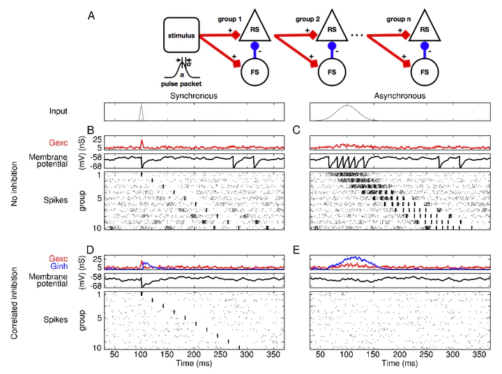 Neurons in the neocortex receive a large number of excitatory and inhibitory synaptic inputs. Excitation and inhibition dynamically balance each other, with inhibition lagging excitation by only few milliseconds. To characterize the functional consequences of such correlated excitation and inhibition, we studied models in which this correlation structure is induced by feedforward inhibition (FFI). Simple circuits show that an effective FFI changes the integrative behavior of neurons such that only synchronous inputs can elicit spikes, causing the responses to be sparse and precise. Further, effective FFI increases the selectivity for propagation of synchrony through a feedforward network, thereby increasing the stability to background activity. Last, we show that recurrent random networks with effective inhibition are more likely to exhibit dynamical network activity states as have been observed in vivo. Thus, when a feedforward signal path is embedded in such recurrent network, the stabilizing effect of effective inhibition creates an suitable substrate for signal propagation. In conclusion, correlated excitation and inhibition support the notion that synchronous spiking may be important for cortical processing.