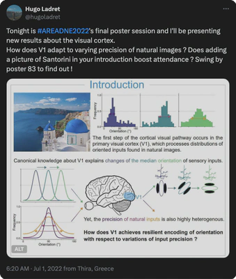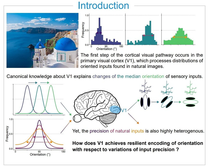 On a daily basis, the primary visual cortex (V1) detects oriented elements from sensory inputs made of orientation distributions. To remain selective to a large variety of possible input configurations, V1 has to account for the precision of these inputs. Here, we decode the population activity of V1 to uncover a neural code which achieves invariance to input precision. Extracellular recordings were made from 247 V1 neurons in anesthetized cats in response to visually presented naturalistic textures (a). These textures were generated from two parameters : orientation and orientation precision. Using multinomial logistic regression, we were able to recover these two parameters from the population activity. We report two previously unknown types of neurons in V1 : predominantly infragranular neurons that encode solely orientation, and predominantly supragranular neurons which co-encode both orientation and its precision. Using a simple mean-rate population model, we observed that recurrent cortical inhibition can single-handedly account for the existence of these two types of neurons.