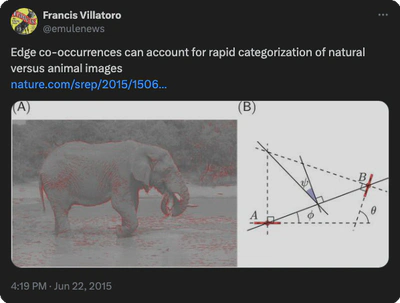 Laurent Perrinet de l’Institut de Neurosciences de la Timone à Marseille et James Bednar de l’université d’Edinburgh en Écosse, ont modélisé la façon dont nous pouvons classer différentes catégories d’images. Leur l’objectif initial était de différencier des scènes visuelles naturelles de scènes d’intérieur, mais ils ont pu montrer que ce système simple de classification permettait aussi de détecter en une fraction de seconde des animaux dans une image. En effet, ils ont mis en évidence qu’un niveau de performance comparable à celui d’observateurs humains est atteignable tout en utilisant un niveau de représentation très primitif, et non, comme cela est généralement admis, après une longue série d’analyses visuelles de plus en plus abstraites (détection des yeux et des membres, puis de la tête et du corps, etc…).