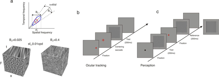 Band-pass motion stimuli for perception and action tasks. (a) In the space representing temporal against spatial frequency, each line going through the origin corresponds to stimuli moving at the same speed. A simple drifting grating is a single point in this space. Our moving texture stimuli had their energy distributed within an ellipse elongated along a given speed line, keeping constant the mean spatial and temporal frequencies. The spatio-temporal bandwidth was manipulated by co-varying Bsf and Btf as illustrated by the (x,y,t) examples. Human performance was measured for two different tasks, run in parallel blocks. (b) For ocular tracking, motion stimuli were presented for a short duration (200ms) in the wake of a centering saccade to control both attention and fixation states. (c) For speed discrimination, test and reference stimuli were presented successively for the same duration and subjects were instructed to indicate whether the test stimulus was perceived as slower or faster than reference.