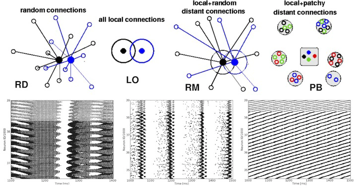 Most studies on the dynamics of recurrent cortical networks are either based on purely random wiring or neighborhood couplings. Neuronal cortical connectivity, however, shows a complex spatial pattern composed of local and remote patchy connections. We ask to what extent such geometric traits influence the ’’ idle’’ dynamics of two-dimensional (2d) cortical network models composed of conductance-based integrate-and-fire (iaf) neurons. In contrast to the typical 1 mm2 used in most studies, we employ an enlarged spatial set-up of 25 mm2 to provide for long-range connections. Our models range from purely random to distance-dependent connectivities including patchy projections, i.e., spatially clustered synapses. Analyzing the characteristic measures for synchronicity and regularity in neuronal spiking, we explore and compare the phase spaces and activity patterns of our simulation results. Depending on the input parameters, different dynamical states appear, similar to the known synchronous regular ’’ SR’’ or asynchronous irregular ’’ AI’’ firing in random networks. Our structured networks, however, exhibit shifted and sharper transitions, as well as more complex activity patterns. Distance-dependent connectivity structures induce a spatio-temporal spread of activity, e.g., propagating waves, that random networks cannot account for. Spatially and temporally restricted activity injections reveal that a high amount of local coupling induces rather unstable AI dynamics. We find that the amount of local versus long-range connections is an important parameter, whereas the structurally advantageous wiring cost optimization of patchy networks has little bearing on the phase space.