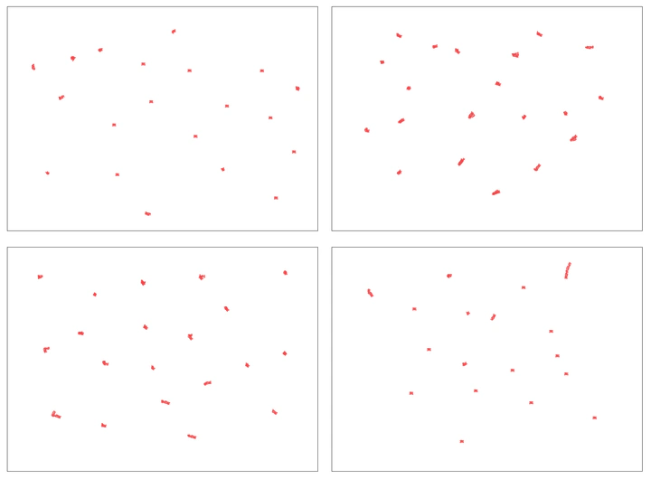 Four sets of dots drawn during the presentation with the instruction “Place 20 dots at random in the frame”. This shows that we tend to judge noise differently to pure independent noise. This reflects some prior information (here on some spacing between dots) which are learned by our brains.- workshop organisé par les étudiants du master de sciences cognitives les 23 et 24 janvier 2023.