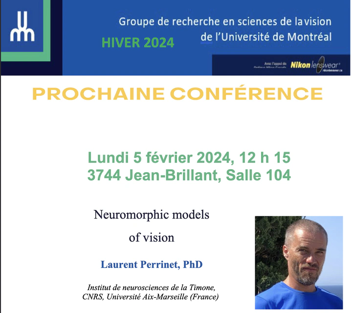 Event-based visionSeminar at UdeM’s School of Optometry, MontréalLaurent U Perrinet2023-12-01Cite Slides URLWhen brains meet computing machineshttps://neurosciences.umontreal.ca/wp-content/uploads/sites/6/2024/02/conferenceNikon_Laurent_Perrinet.pdfRelated papers A Robust Event-Driven Approach to Always-on Object RecognitionAntoine Grimaldi, Victor Boutin, Sio-Hoi Ieng, Ryad Benosman, Laurent U PerrinetPDF Cite DOI Press Hal Code URL Learning heterogeneous delays in a layer of spiking neurons for fast motion detectionAntoine Grimaldi, Laurent U PerrinetPDF Cite DOI Code Supplementary MaterialLaurent U PerrinetResearcher in Computational NeuroscienceMy research interests include Machine Learning and computational neuroscience applied to Vision.