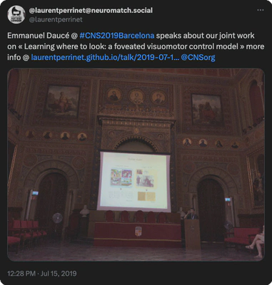 Problem setting: In generic, ecological settings, the visual system faces a tricky problem when searching for one target (from a class of targets) in a cluttered environment. A) It is synthesized in the following experiment: After a fixation period of 200 ms, an observer is presented with a luminous display showing a single target from a known class (here digits) and at a random position. The display is presented for a short period of 500 ms (light shaded area in B), that is enough to perform at most one saccade (here, successful) on the potential target. Finally, the observer has to identify the digit by a keypress. B) Prototypical trace of a saccadic eye movement to the target position. In particular, we show the fixation window and the temporal window during which a saccade is possible (green shaded area). C) Simulated reconstruction of the visual information from the (interoceptive) retinotopic map at the onset of the display and after a saccade, the dashed red box indicating the visual area of the ``what’’ pathway. In contrast to an exteroceptive representation (see A), this demonstrates that the position of the target has to be inferred from a degraded (sampled) image. In particular, the configuration of the display is such that by adding clutter and reducing the size of the digit, it may become necessary to perform a saccade to be able to identify the digit. The computational pathway mediating the action has to infer the location of the target \emph{before seeing it}, that is, before being able to actually identify the target’s category from a central fixation. Results: success Results: failure to classify Results: failure to locate
